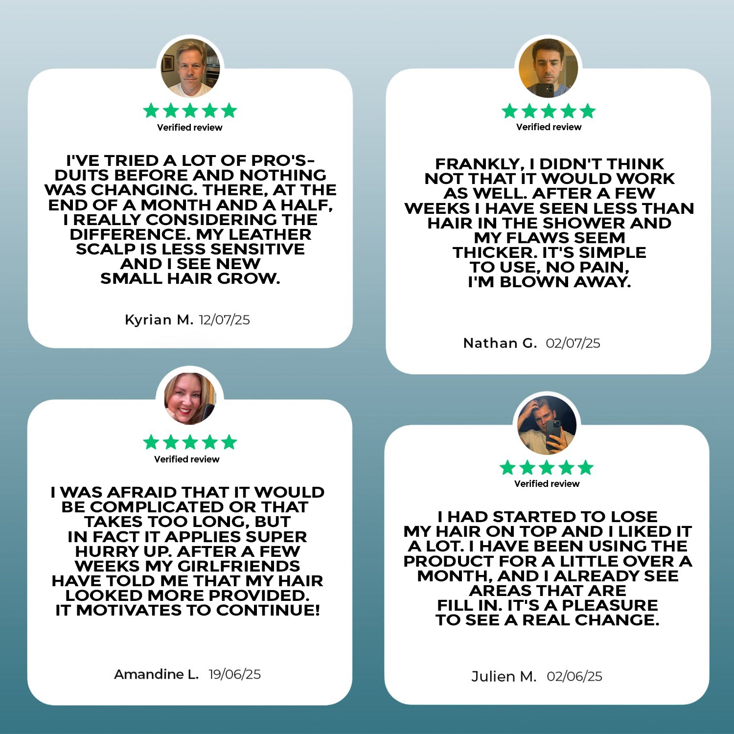 The first signs (less hair in the brush or on the pillow) usually appear after 4 to 6 weeks. For visible results in terms of density and regrowth, it takes 3 to 4 months of regular use, as the hair cycle is naturally slow.
